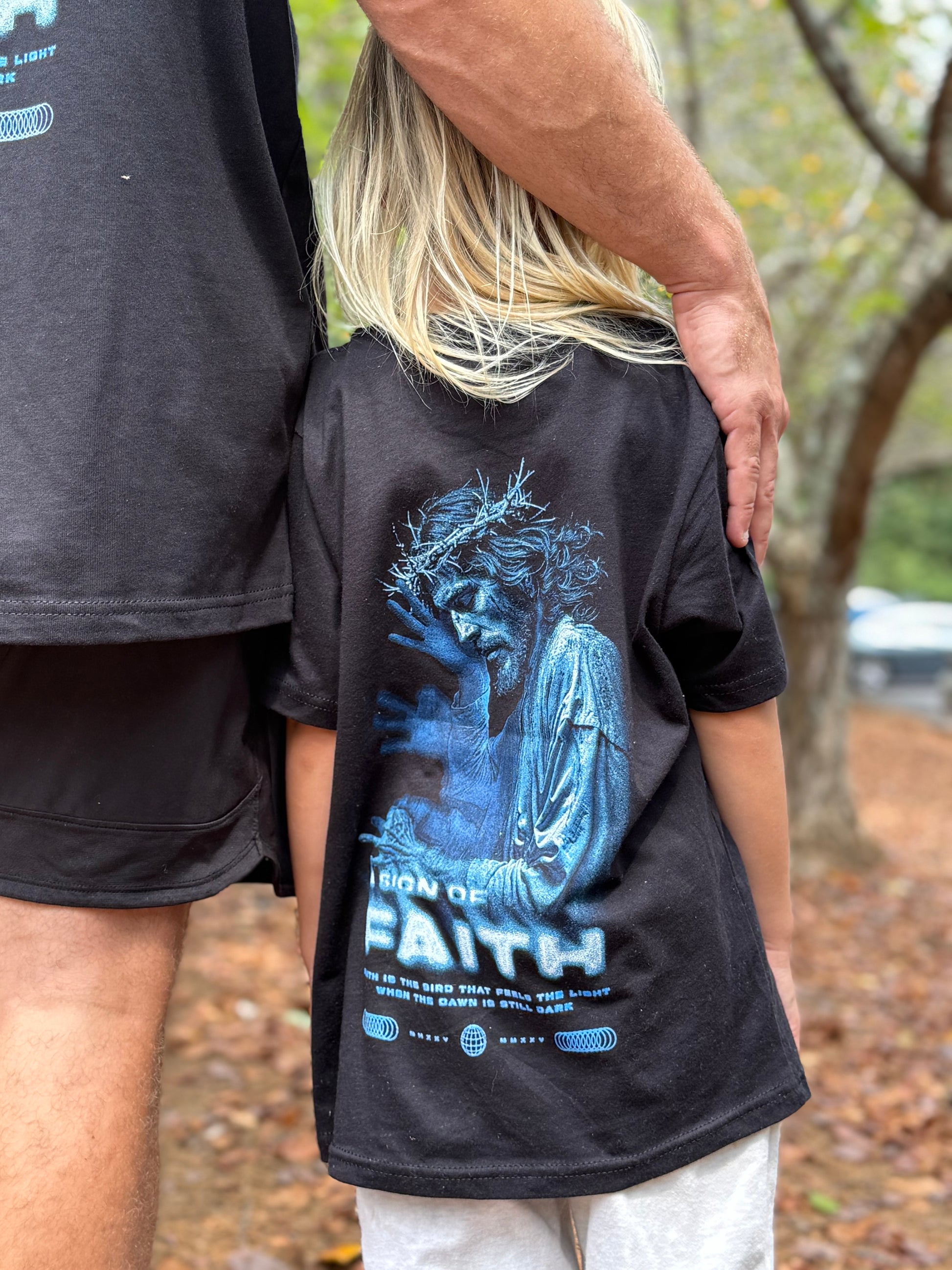 This black OVERSIZED tee delivers effortless style and a powerful message. The back features a striking graphic of Jesus signing the word Faith in American Sign Language. Designed with a relaxed fit and premium cotton for all day comfort, it blends faith and fashion seamlessly. Perfect for casual everyday wear or making a bold statement with your outfit, this tee is more than apparel, it is a testimony.